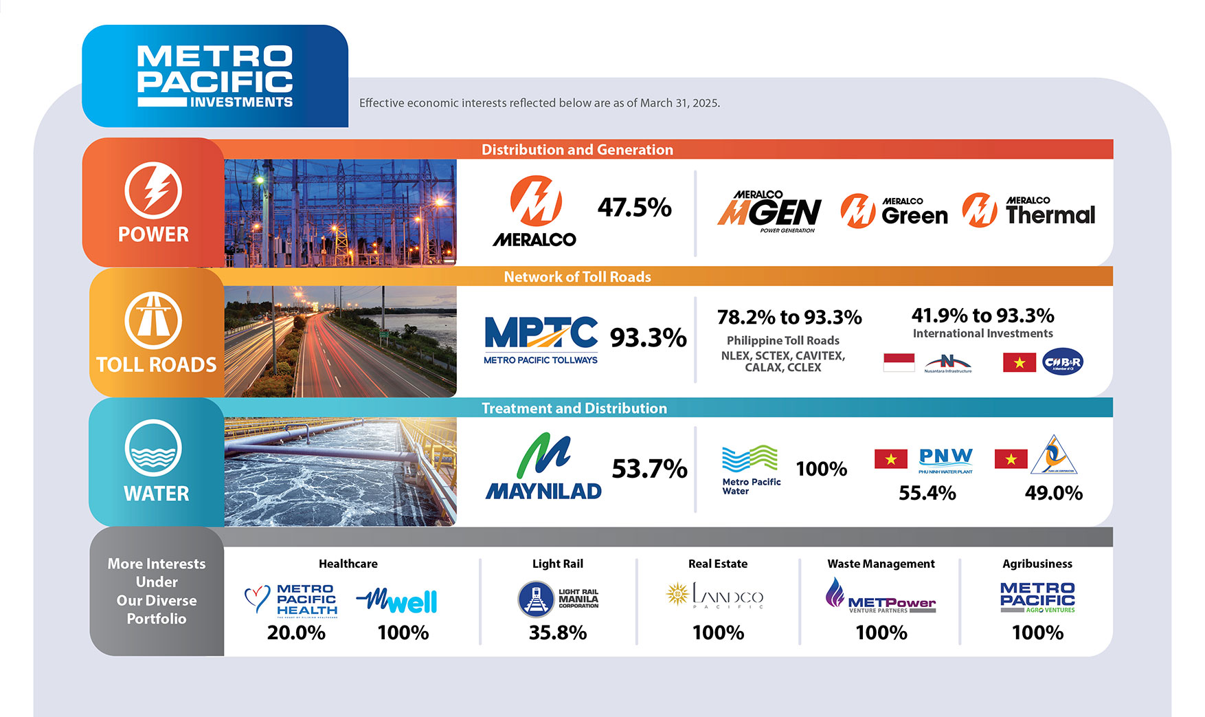 MPIC is a Philippine-based, investment management and holding company registered with the Philippine Securities Exchange Commission. We are a leading infrastructure holding company with a diverse set of assets held through our operating companies. Through acquisitions and strategic partnerships, we seek to create value by upgrading infrastructure, improving operational efficiency, increasing customer coverage and working closely with regulators and other partners in government.